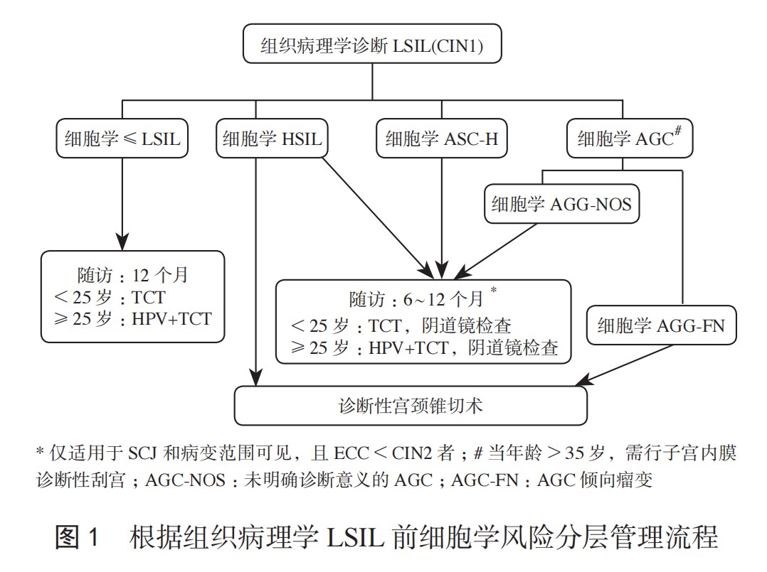 2. 細胞學爲 ASC-H、HSIL 經組織學診斷(duàn)的 LSIL 者處(chù)理原則:① 複核細胞學、組織病理學和陰道鏡檢查,建議按照複查修訂後的診斷進行管理;② 對陰道鏡檢查 SCJ 和病變的上界完全可見,如果 ECC 後組織病理學<CIN2,可行 6~12 個月随訪 [15];③ 對細胞學 HSIL 者,可行診斷性宮頸錐切術。研究表明,基於細胞學 HSIL 和 ASC-H,組織學 LSIL 者 1 年 CIN3+ 風險分别爲 3.9% 和 1.4%[27],因此, 對細胞學 HSIL 的管理應比對 ASC-H 管理更積極 [11]。對於細胞學 ASC-H,除瞭複核細胞學、組織學或陰道鏡以及滿足随訪條件者進行随訪觀察外,不建議首選子宮頸診斷性錐切術。在随訪過程中,細胞學或 HR-HPV 任何一項檢查異常者建議行陰道鏡檢查;細胞學 HSIL 持續 1 年或 ASC-H 持續 2 年者,建議行診斷性錐切術。